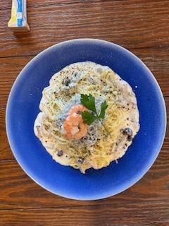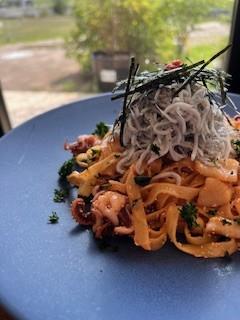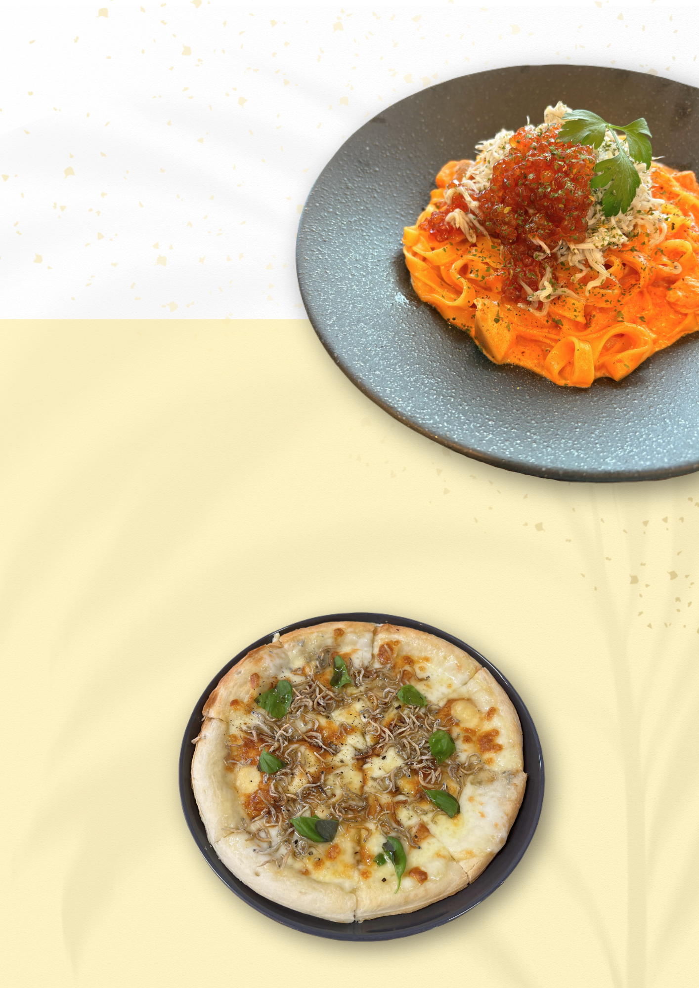 サラミ&ハラペーニョのピザ、冷製シーフードレモンパスタ、